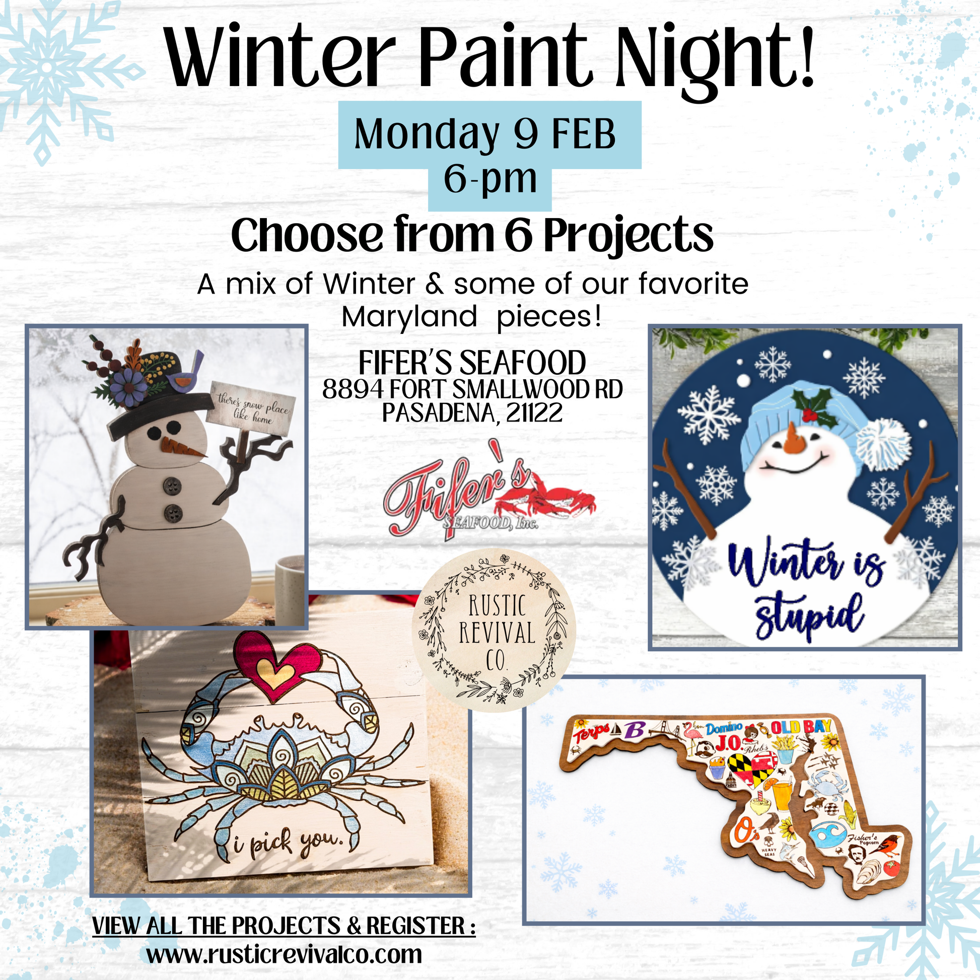 Shake off the winter blahs and come paint with us! Join Rustic Revival Co. for a cozy, creative night at Fifer’s Seafood where you’ll choose from 6 exclusive wood projects — a fun mix of winter designs and some of our most-loved Maryland pieces.