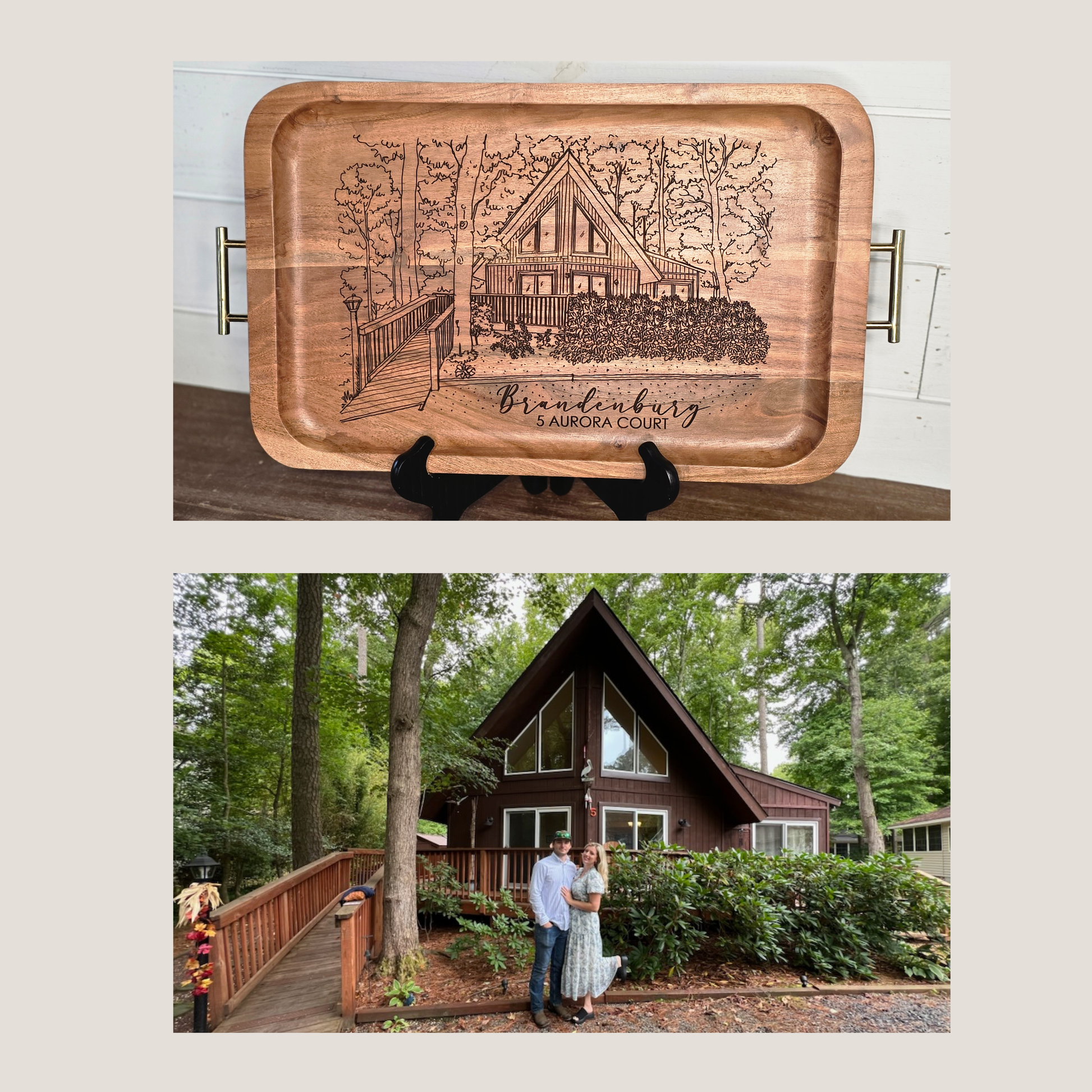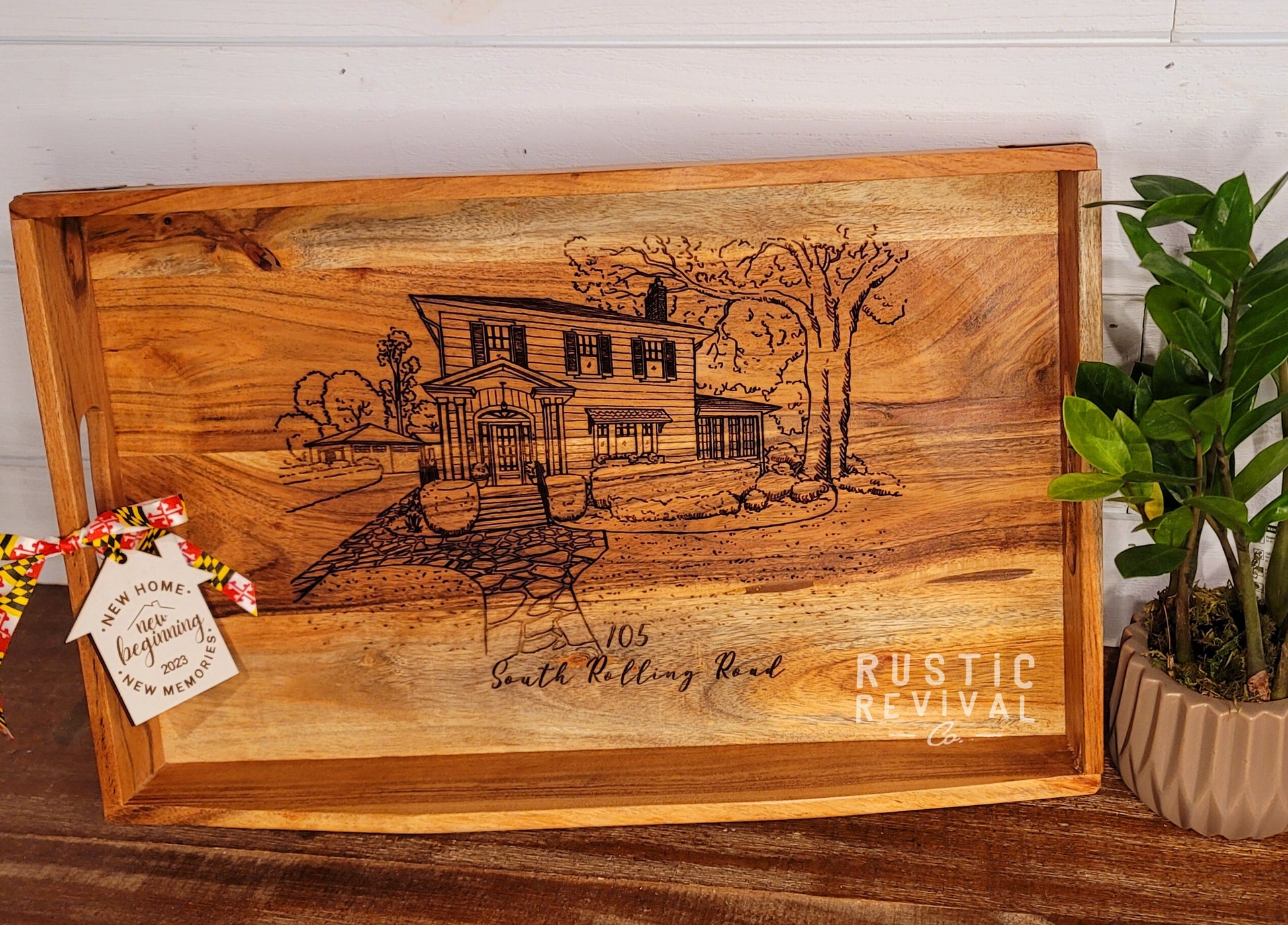 Capture the essence of cherished spaces with our Custom-Drawn House & Building Portraits, Engraved Solid Wood Trays, and Wall Art. ๐กโจ Ideal for saying hello or goodbye to a special place, a thoughtful realtor closing gift, or expressing love through art. Order now for a personalized touch that lasts a lifetime!